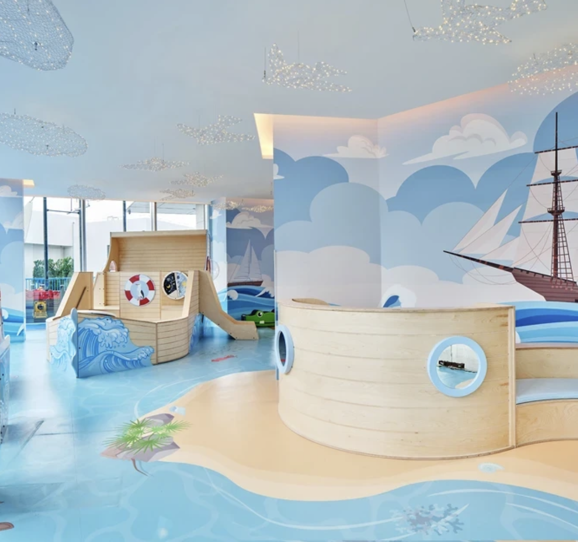 整个空间弥漫着海洋冒险的氛围。墙面壁画描绘了船只、宝藏箱和海鸟,将空间变成一本立体故事书;地面设计如同沙滩与海洋自然延展;云朵与飞鸟造型的灯具,则为整个区域增添柔和温暖的光感。