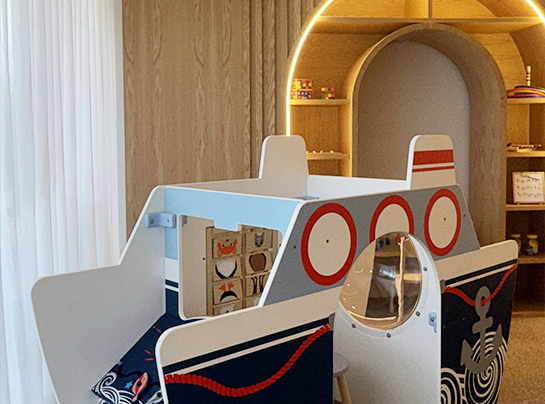 儿童区配备了多款 IKC 经典互动游戏,优雅融入塔楼的精致设计中。包括白天与黑夜、试衣间、串珠桌,以及登船与离底起锚模块的互动游戏组合。每一处细节都经过精心挑选,既能带来孩子们的欢乐,又不会破坏空间的优雅格调。