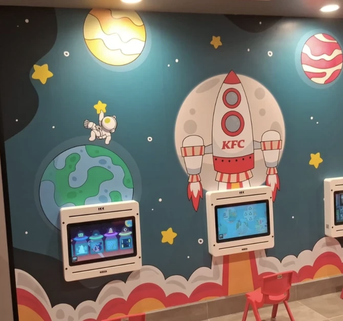 在KFC Mexico的一家门店,一面原本空白的墙被改造成充满欢乐的太空探险空间,孩子们一走近就会被吸引其中。这面色彩丰富的游戏墙为餐厅注入了活力,也让家长可以在餐桌旁享受片刻的轻松时光。